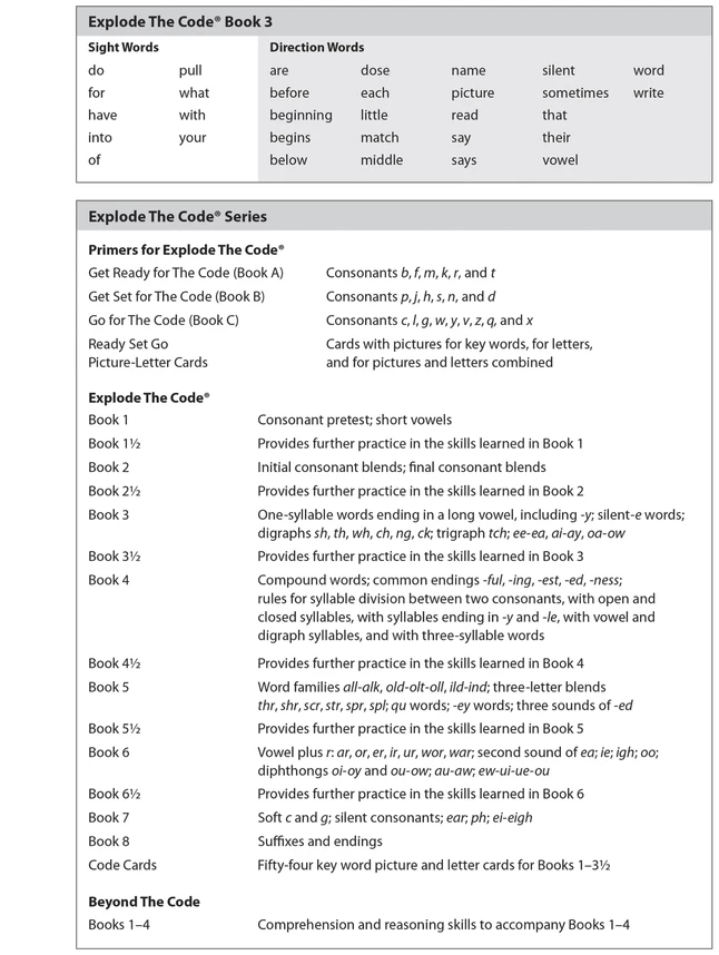 Explode The Code Book 3 introduces students to y as a vowel, silent-e, consonant digraphs (sh, th, wh, ch, -tch, -ng, -ck), and vowel digraphs (ee, ea, ai, ay, oa, ow). Through a variety of pen-to-paper exercises, students will get to practice blending sounds to read and write one-syllable words that include digraphs and long vowel sounds.