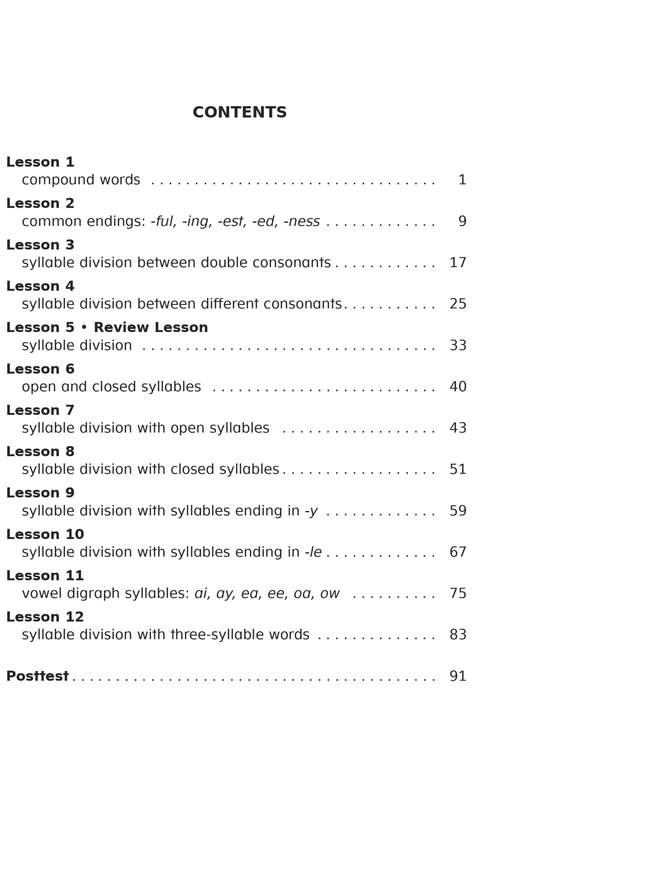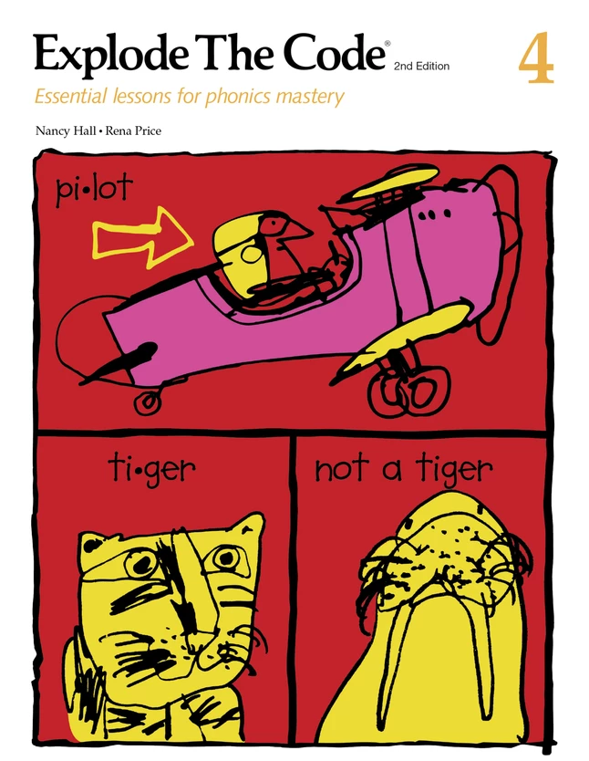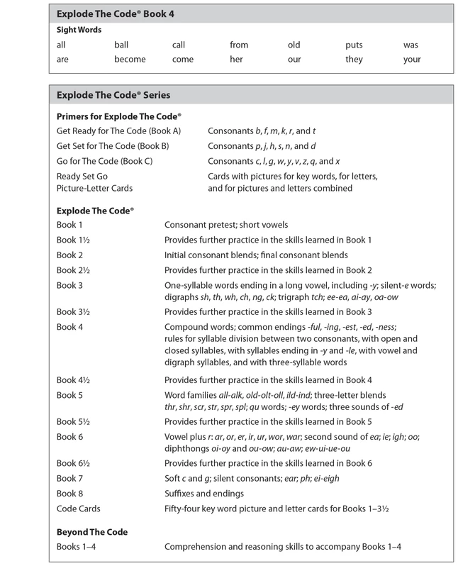 Explode The Code Book 4 introduces students to compound words, common word endings (-ful, -ing, -est, -ed, -ness), syllable types (open, closed, Cle, silent-e, digraph) and syllabication with 2- and 3-syllable words. Through a variety of pen-to-paper activities, students will get to practice blending sounds to read and write multisyllabic words.