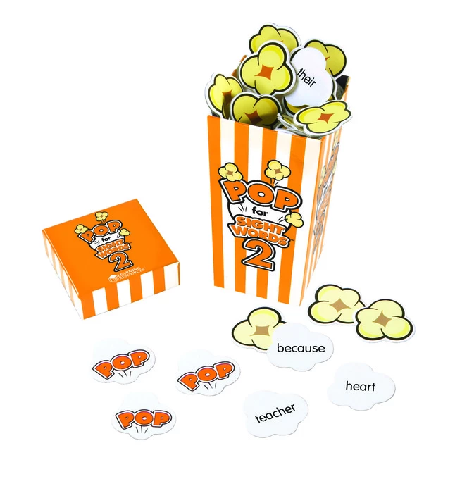 - Set of 100 die-cut popcorn card game pieces include 92 sight words and 8 POP cards (that means player should put a sight word piece into popcorn bucket)