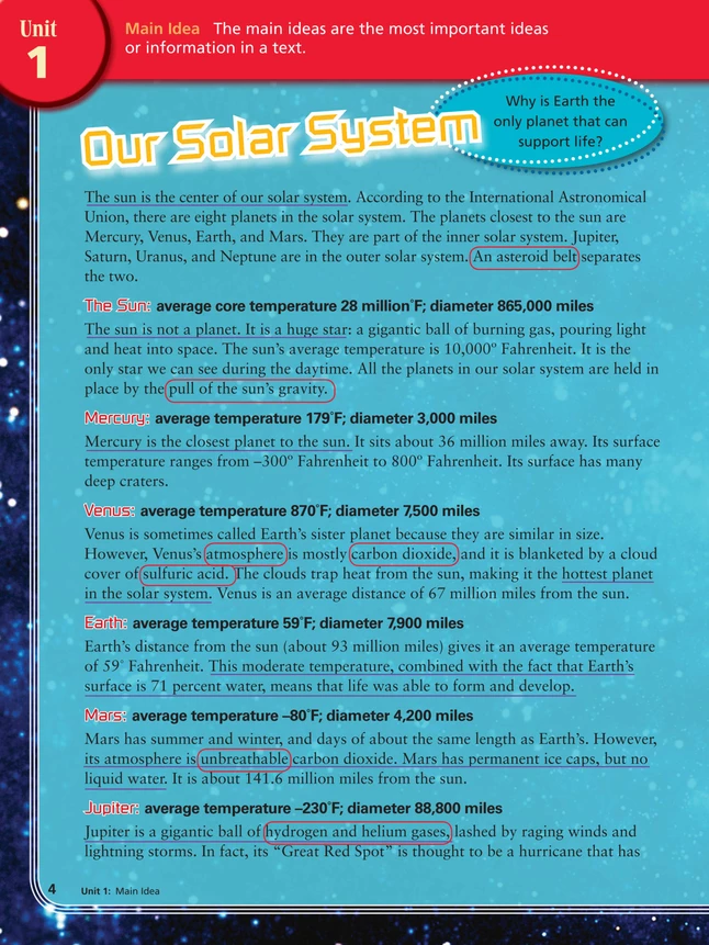 - Text features such as maps, graphs, tables, illustrations and real photos, and glossaries help aid reading comprehension and spiral-based questions after each passage