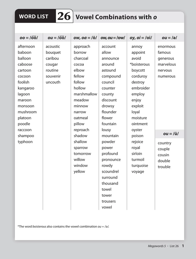 Skills addressed include vowel variations, List 26: Vowel combinations with o, List 27: Vowel combinations with a, List 28: Vowel combinations with e, and List 29: Vowel sounds of y.