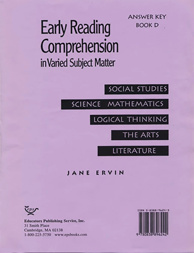 The Answer Key to Book D provides answers to the exercises following each reading selection. Each workbook in the Reading Comprehension Series has selections covering social studies, science, literature, mathematics, philosophy, logic, language, and the arts.