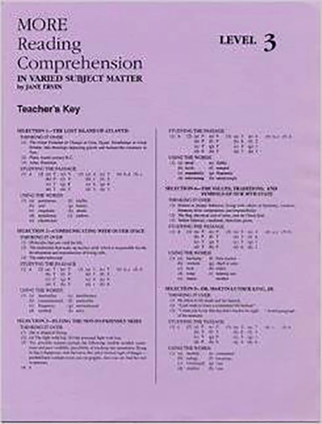 Level 3 Answer Key provides the answers to the exercises. Each workbook in the Reading Comprehension Series has selections covering social studies, science, literature, mathematics, philosophy, logic, language, and the arts.