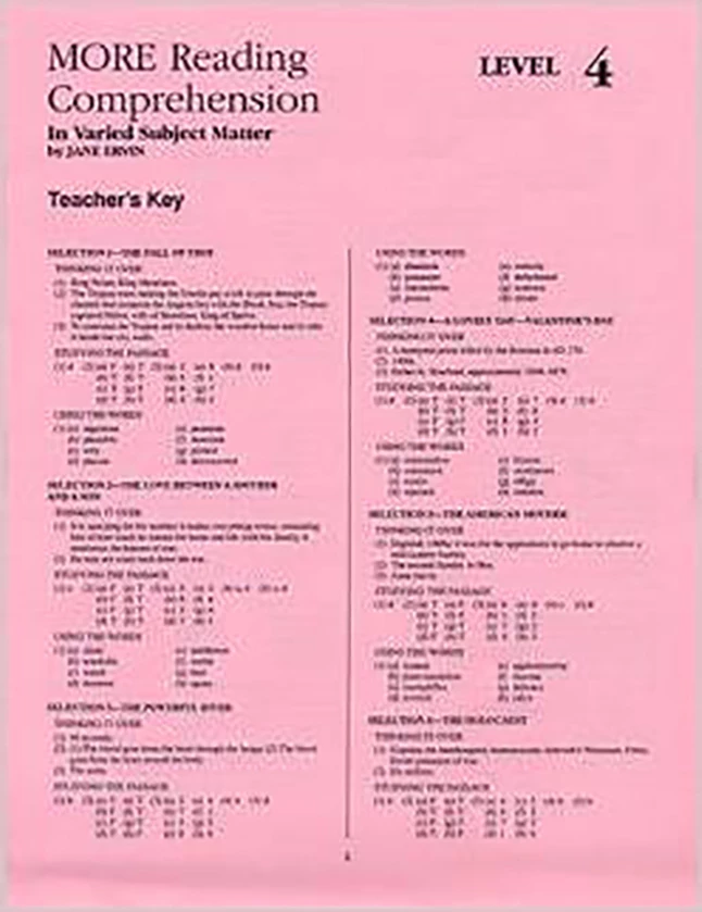 Level 4 Answer Key provides the answers to the exercises. Each workbook in the Reading Comprehension Series has selections covering social studies, science, literature, mathematics, philosophy, logic, language, and the arts.