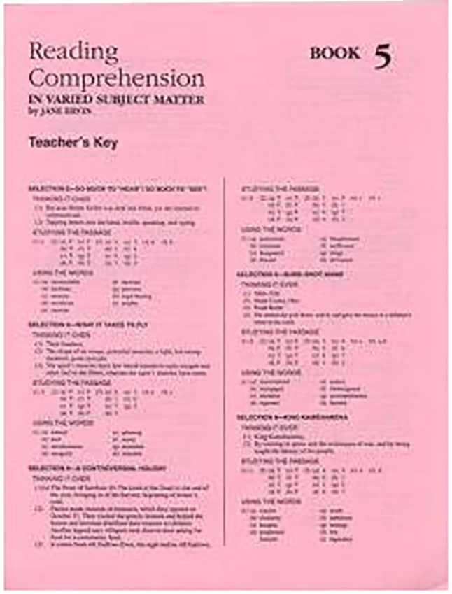 The Answer Key to Book 5 provides the answers to the exercises. Each workbook in the Reading Comprehension Series has selections covering social studies, science, literature, mathematics, philosophy, logic, language, and the arts.