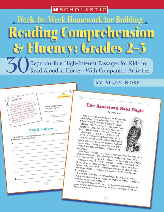 Scholastic presents a Week-by-Week Homework for Building Reading Comprehension and Fluency, 30 Reproducible High-Interest Passages for Kids to Read Aloud at Home by Mary Rose. A follow-up to her original Week-by-Week, this time Mary Rose selected these 30 short, reproducible passages for students to take home with the companion comprehension activity and practice reading with the support of a grown-up. Includes easy parent tips. Results are phenomenal! Teachers, parents, and students alike rave about this simple, effective way to boost reading skills. Softcover book has 96 pages and week-by-week homework. Grades 2 to 3.