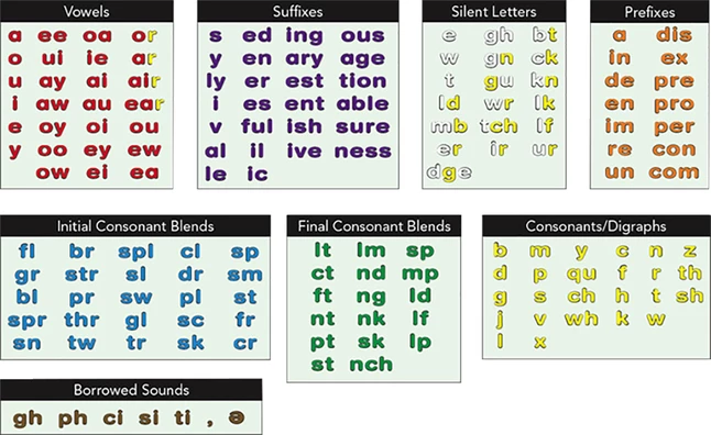 The Touch-Units include more than 200 three-dimensional textured-plastic letter units, color-coded by category, and representing all English graphemes. Touch-Units are soft; the topside is rough and the underside is smooth. If students place the Touch-Unit upside down, it will not lie flat, a clue that helps students self-correct letter reversals. Categories include single consonants, consonant digraphs, silent letter combinations, initial consonant blends, final consonant blends, borrowed sounds, schwa, and punctuation marks, vowels, silent letters, r-controlled vowels, vowel combinations, prefixes, and suffixes.
