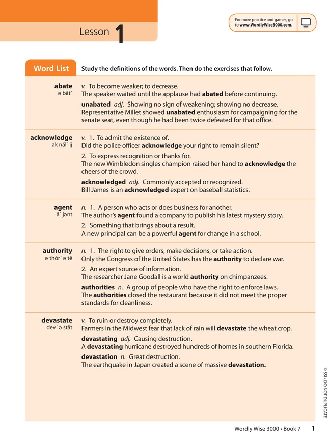 - Each lesson begins with a Word List that includes pronunciations, parts of speech, and concise definitions, and uses each word in an interesting, contextual sentence
