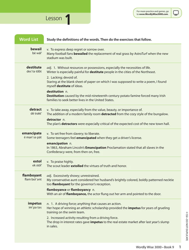 - Each lesson begins with a Word List that includes pronunciations, parts of speech, and concise definitions, and uses each word in an interesting, contextual sentence