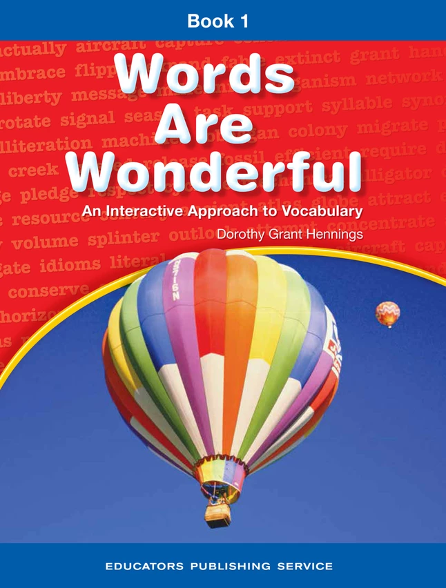 Words Are Wonderful: An Interactive Approach to Vocabulary, Book 1 introduces students to dictionary guide words and entries, homophones, compound words, words with multiple meanings, alliteration, synonyms and antonyms, prefixes, roots, suffixes, contractions, possessives, analogies, idioms, and inflectional verb endings.