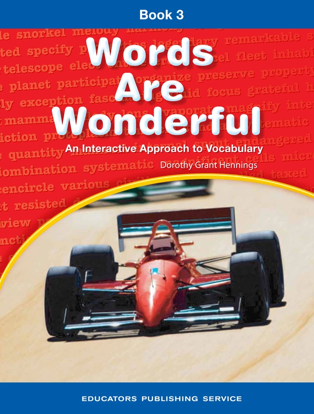 Words Are Wonderful: An Interactive Approach to Vocabulary Book 3 builds student vocabulary skills through independent and collaborative exercises and activities on dictionary entries, word origins, context clues, similes and metaphors, idioms, compound words, onomatopoeia, alliteration, words with multiple meanings, synonyms and antonyms, prefixes, roots, suffixes, analogies, and footnotes.